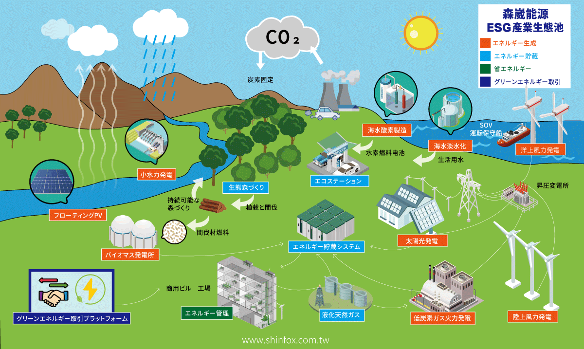 グローバルな持続可能性の推進や台湾のエネルギー転換政策の流れの中で、シンフォックス エネルギー計画は「ESG産業生態プール」を構築し、太陽光発電、洋上風力発電、陸上風力発電、水力発電などの再生可能エネルギー発電所の建設・O&M、クリーンエネルギーの天然ガス(LNG)輸入、グリーン電力取引プラットフォームやESCO省エネ、エネルギー貯蔵のデバイス技術、森林の炭素権、オフショア海洋エンジニアリングなどの包括的なESGサービスを提供しています。