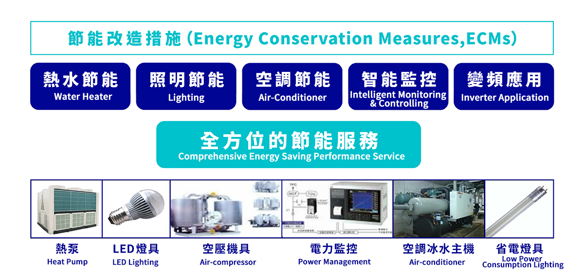 本公司全方位節能服務大致在用途上分為熱水節能、空調節能、照明設備、變頻節能以及智能監控等五個面向。
