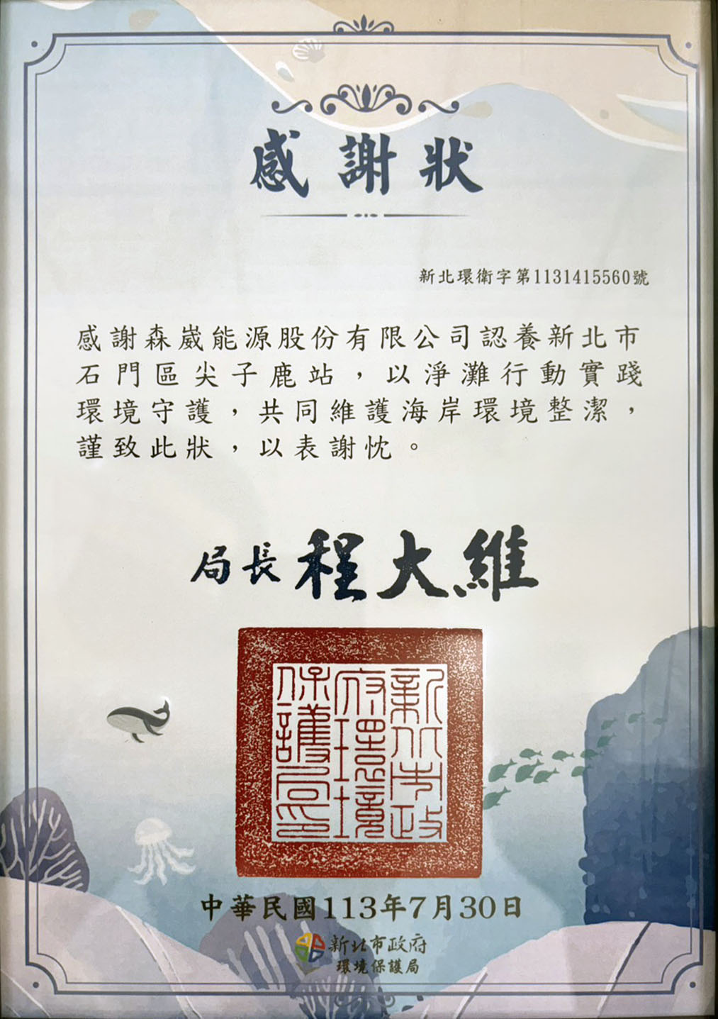森崴能源以保護地球、永續發展、綠能減碳、潔淨能源為核心價值,每年安排森崴與集團員工及機關團體共同參與淨攤及淨河活動,讓森崴及共同理念的人一起為地球環境盡一份心力。未來預計參與由政府推動之認養海灘計畫。