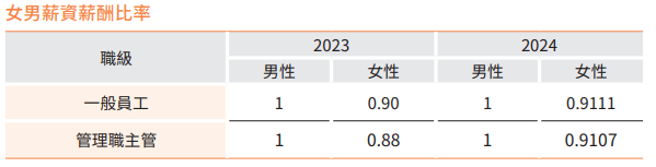 本公司給予同仁男女同工同酬之條件及平等晉升機會,2024 年度女性職員佔比為42%,女性主管佔比為26.67%,本公司因產業性質特殊,且具備經驗者以男性居多,故女性主管佔比不高,未來在晉升主管時會以男女平等觀點進行相關作業。