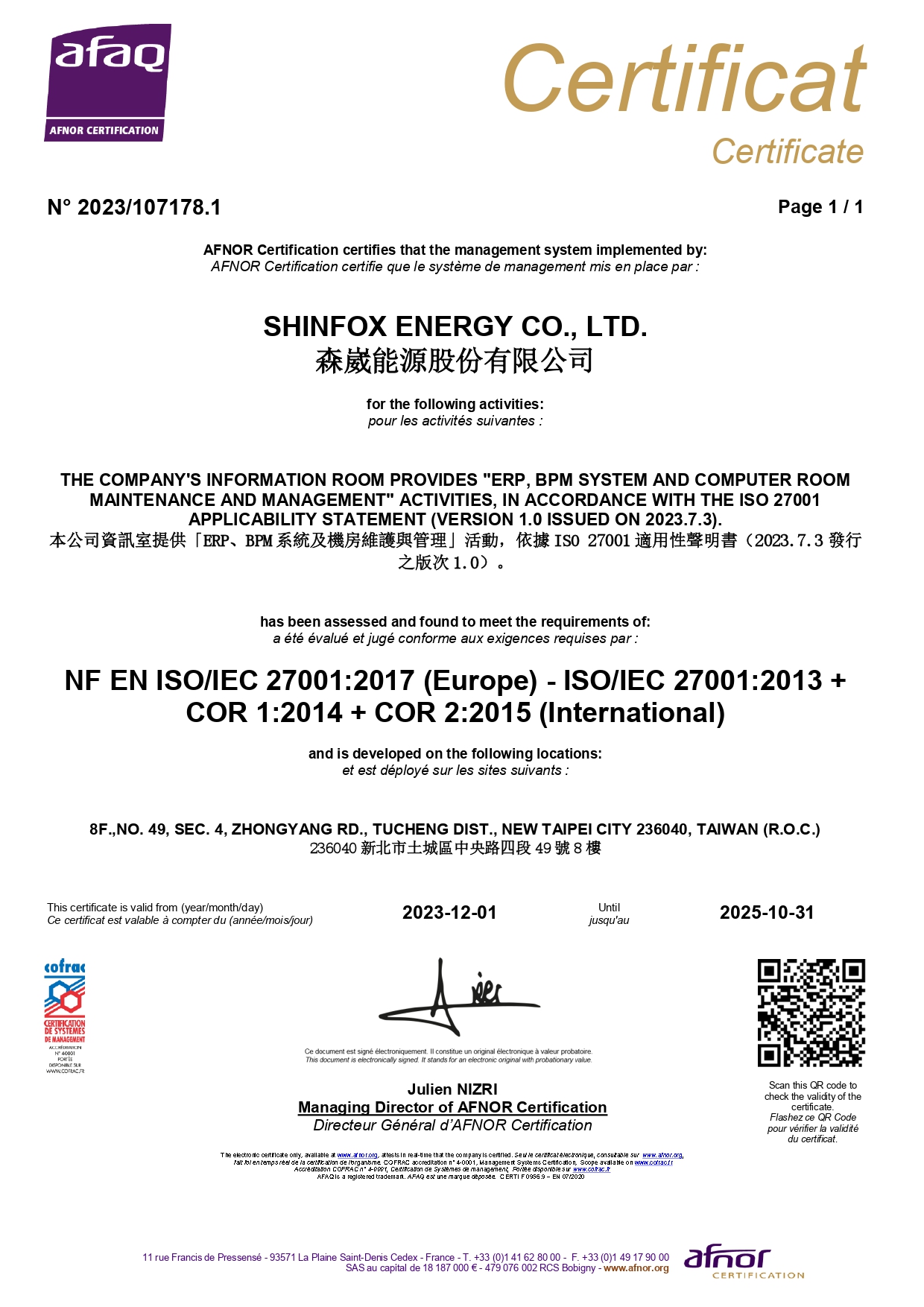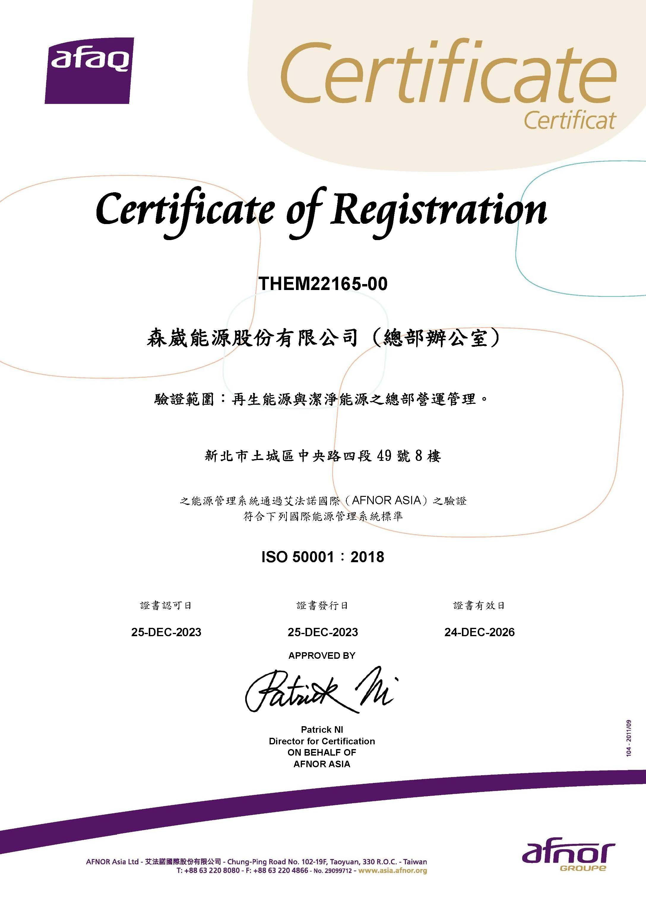品質管理 本公司秉持著企業永續發展的理念,在環境面隨著全球淨零排放的趨勢下,為了提升能源使用效率,導入ISO 50001能源管理系統並取得證書。 在公司治理面為了預防及降低資安風險,落實及持續更新嚴謹的資安措施,導入ISO27001資通安全管理系統並取得證書。 除以上企業永續發展相關的品質管理外,本公司在執行相關業務時,亦取得各項行業之從業資格證書,以確保達到法令遵循的要求。